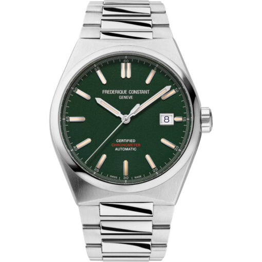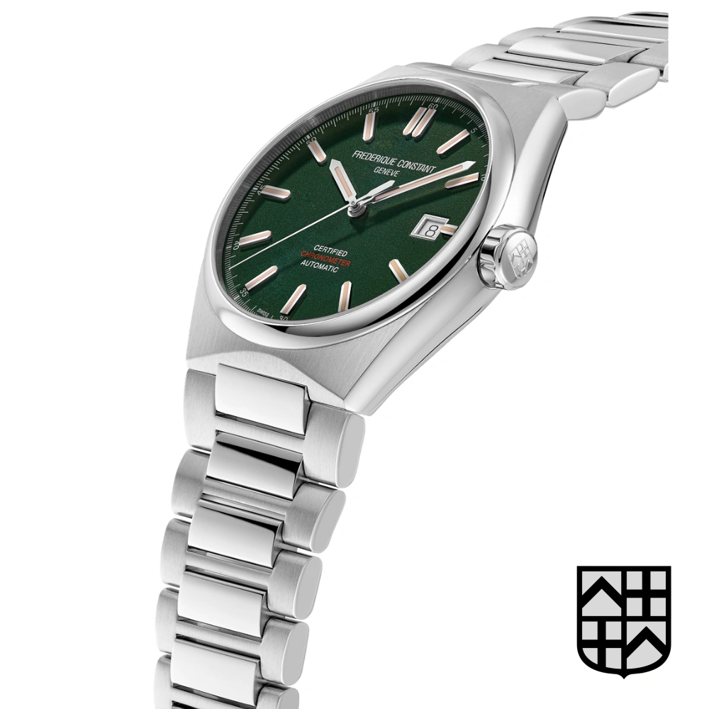 Vỏ và dây đeo bằng thép không gỉ tông màu bạc. Vành thép không gỉ tông màu bạc cố định. Mặt số màu xanh lá cây với kim và vạch chỉ giờ tông màu bạc. Thang phút xung quanh vành trong. Kiểu mặt số: Analog. Kim và vạch chỉ giờ phát quang. Hiển thị ngày ở vị trí 3 giờ. Bộ máy tự động Frederique Constant Calibre FC-303 (Base SW200) với khả năng dự trữ năng lượng 38 giờ. Mặt kính sapphire chống trầy xước. Mặt sau trong suốt, có thể nhìn xuyên qua. Hình dạng vỏ tròn, kích thước vỏ: 39 mm, độ dày vỏ: 10,34 mm. Chiều rộng dây đeo: 24 mm. Khóa cài. Chống nước ở độ sâu 100 mét / 330 feet. Chức năng: ngày, giờ, phút, giây. Thông tin bổ sung: đi kèm với một dây đeo bằng da màu xanh lá cây bổ sung. Dòng Highlife. Kiểu đồng hồ thể thao. Nhãn đồng hồ: Sản xuất tại Thụy Sĩ.
